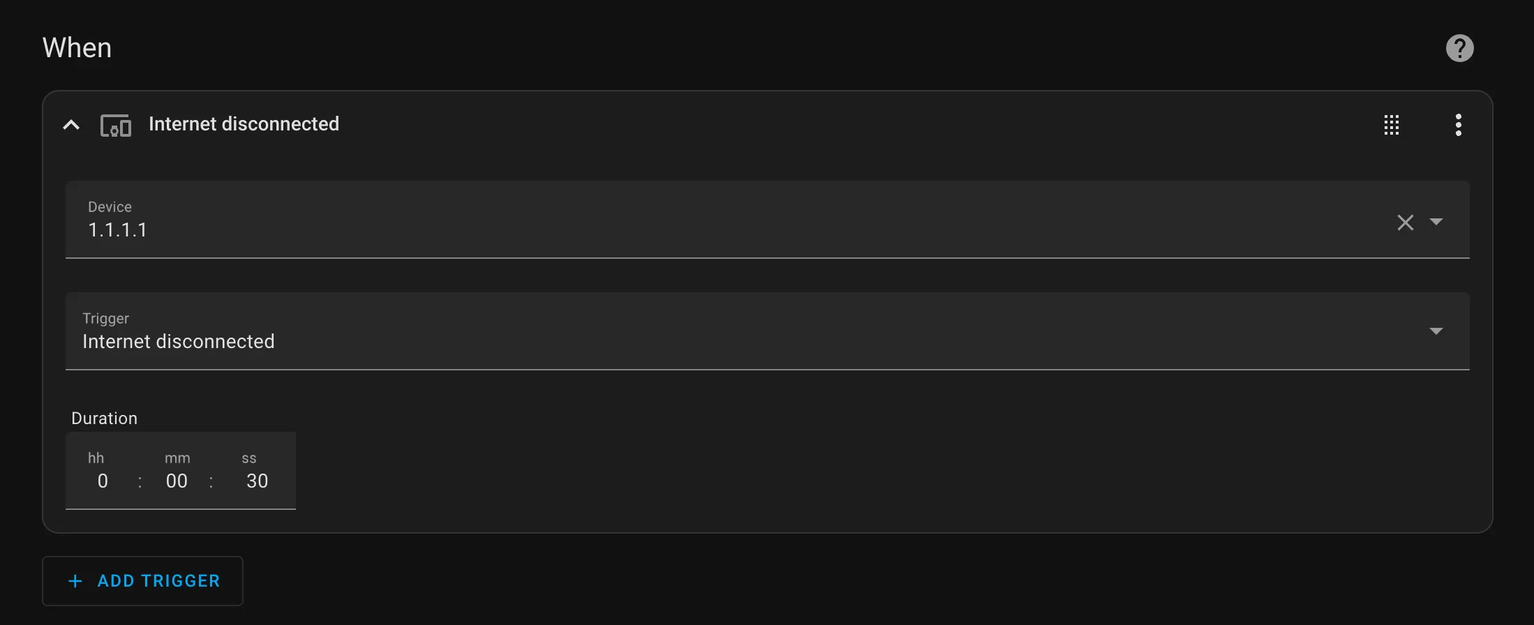 I created my trigger by clicking “Add trigger > Device” and then selecting the “Internet” device as the device and “Internet disconnected” as the trigger. I put 30 seconds as the duration as a starting point: