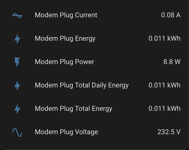 Setting them up was trivial — all I had to do was plug them in, connect to the Wi-Fi network they created, and input my router’s password in the setup page, after which Home Assistant detected them automatically. As a bonus, these smart plugs also provide me with power consumption information (not that I would be looking at it, but still):