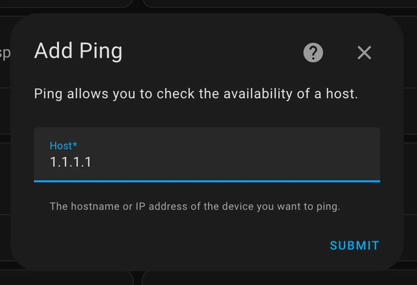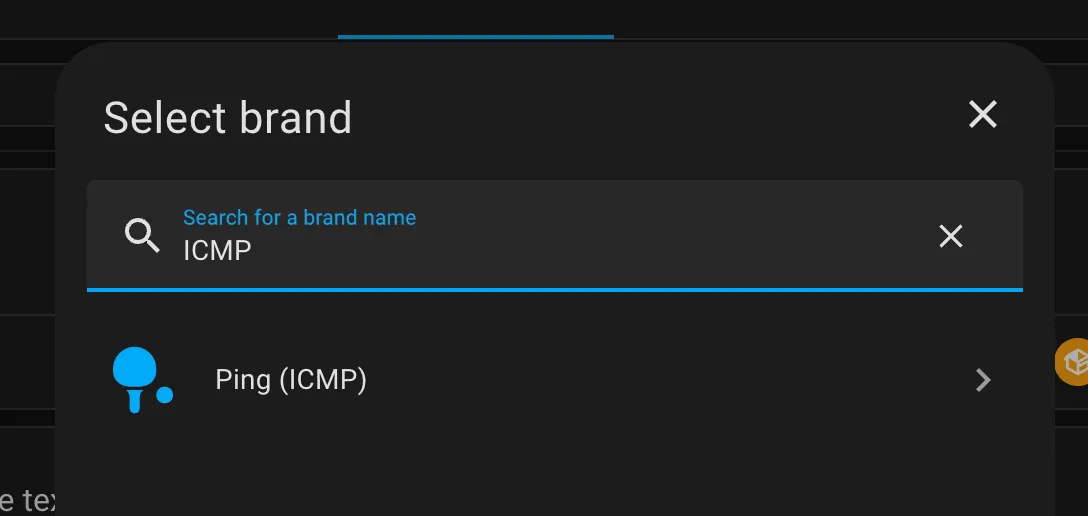 To create a Ping device, one needs to go to “Settings > Devices & services”, then click “Add integration” and select “Ping (ICMP)”: